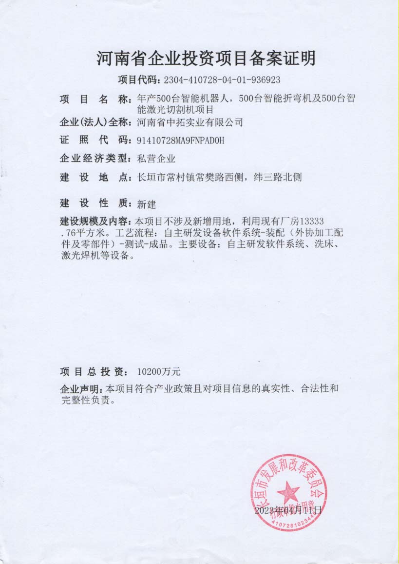 大圣智能折彎機(jī),機(jī)械臂,激光切割機(jī)工廠備案證明
